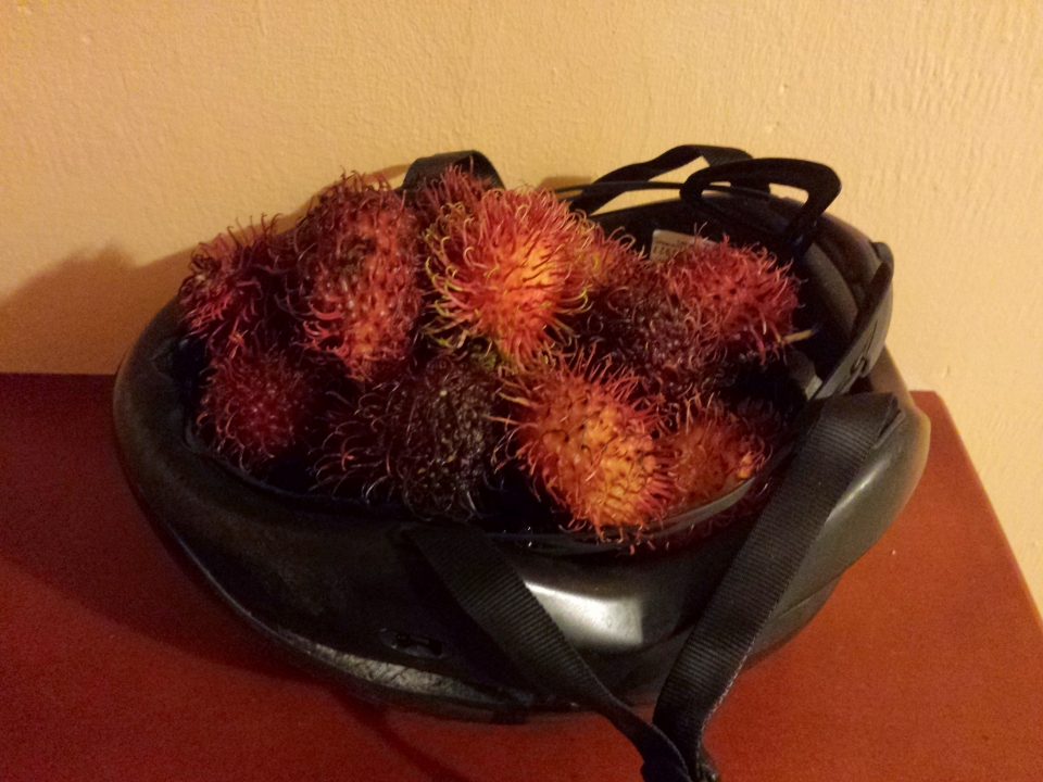 As it turned out, they were going to visit their brother/uncle in the same town where I was trying to go. First, they were stopping at a cousin's place to pick up a trailer for their truck. I met them there, where we picked a whole tub full of rambutans, and ate dozens more. David Sr.'s father had cultivated several different breeds of rambutans, some of them new and unique, and now their family grows some on their land and sells them on the side. All colors: bright red, wine red, purple, bright yellow, pink, and red with yellow tips. ALL of them were tasty! They gave me a bagful to take with me.