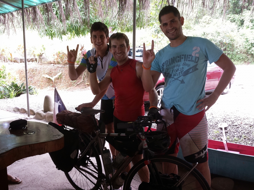 We went farther up the road to Rio Claro, only 35 km from the Panama border. David Sr.'s brother whipped up some tasty pasta and we talked some more about riding. These guys have some serious mountain bikes, better than the one I have at home, and with better components than Valeria! We talked even more about touring, where they might want to go and how to prepare. I of course told them about WarmShowers. Now maybe another touring cyclist will get their hospitality!