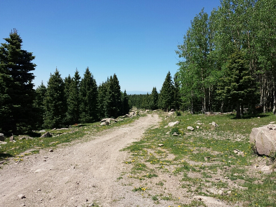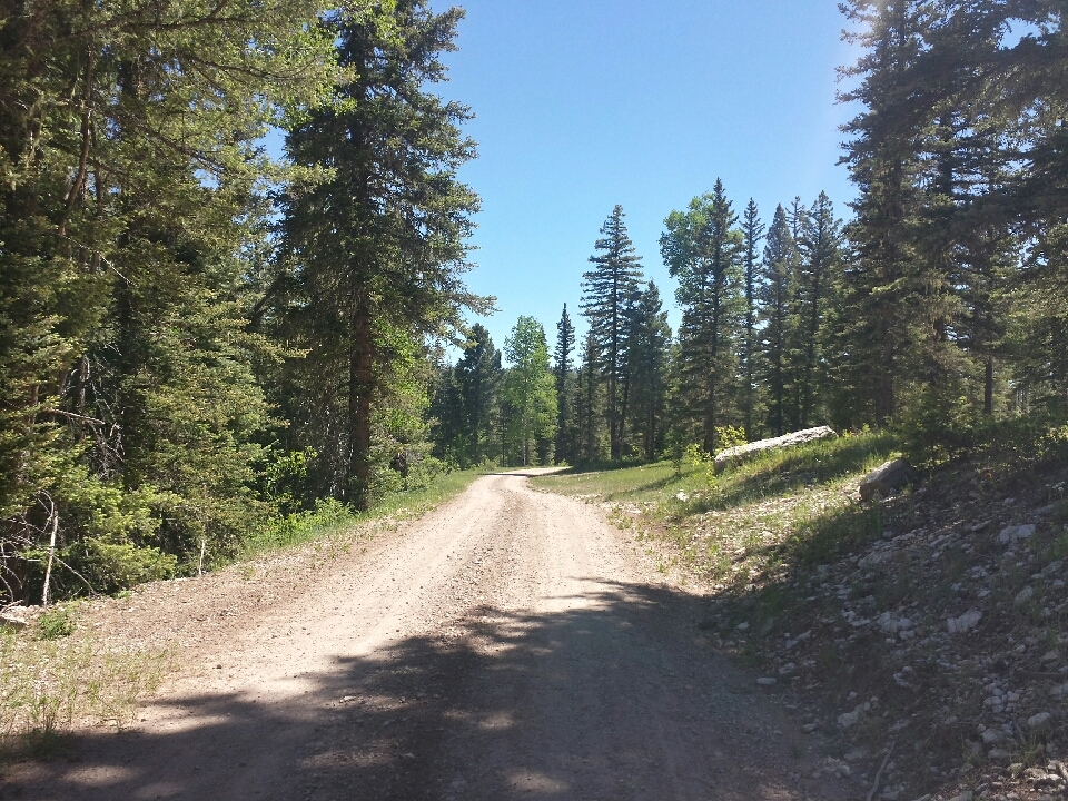 Coming out of Cuba meant a huge climb, but on pavement. As soon as I got to the top and made the turnoff into the woods, it was like being in a different country. Yesterday I had seen virtually no vegetation and no water whatsoever in some of the most rugged terrain I can recall. Today was nothing but pine and aspen, with the occasional bright mountain meadow, frequently punctuated with crystal-clear babbling brooks.
